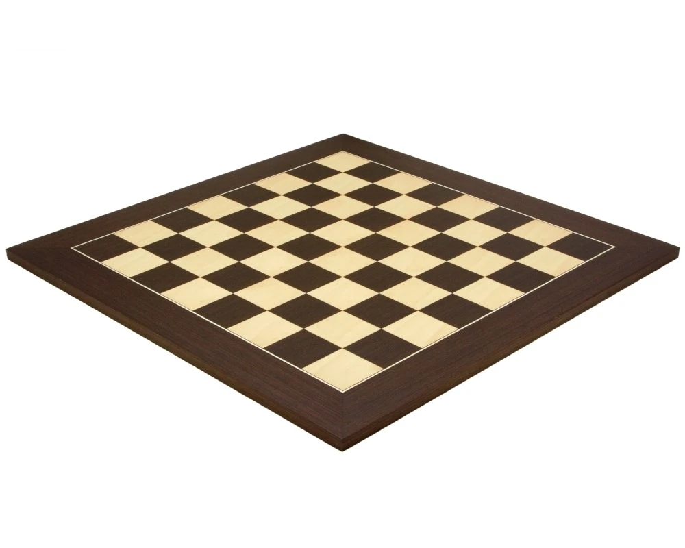 Wenge grain is geometrically parallel and rich in dark tones – well suited to modern interiors. This superb quality large chess board is produced by prestigious chess board maker Rechapados Ferrer S.A. of Spain. High grade wenge and maple veneered construction is used throughout, including on the board’s base. Up to date fabrication techniques are used, presenting a board with contemporary lines and critical detailing. This board is very contemporary in design and is perfect for accompanying chess pieces with 3.75 inch (95 mm) kings.