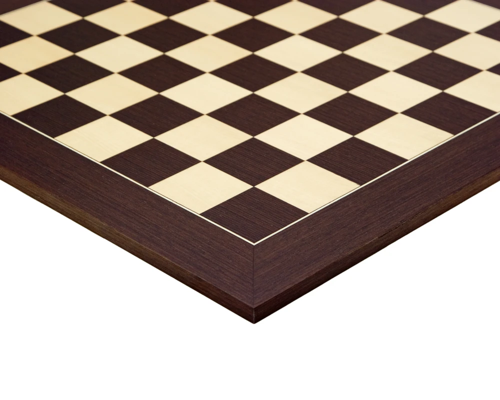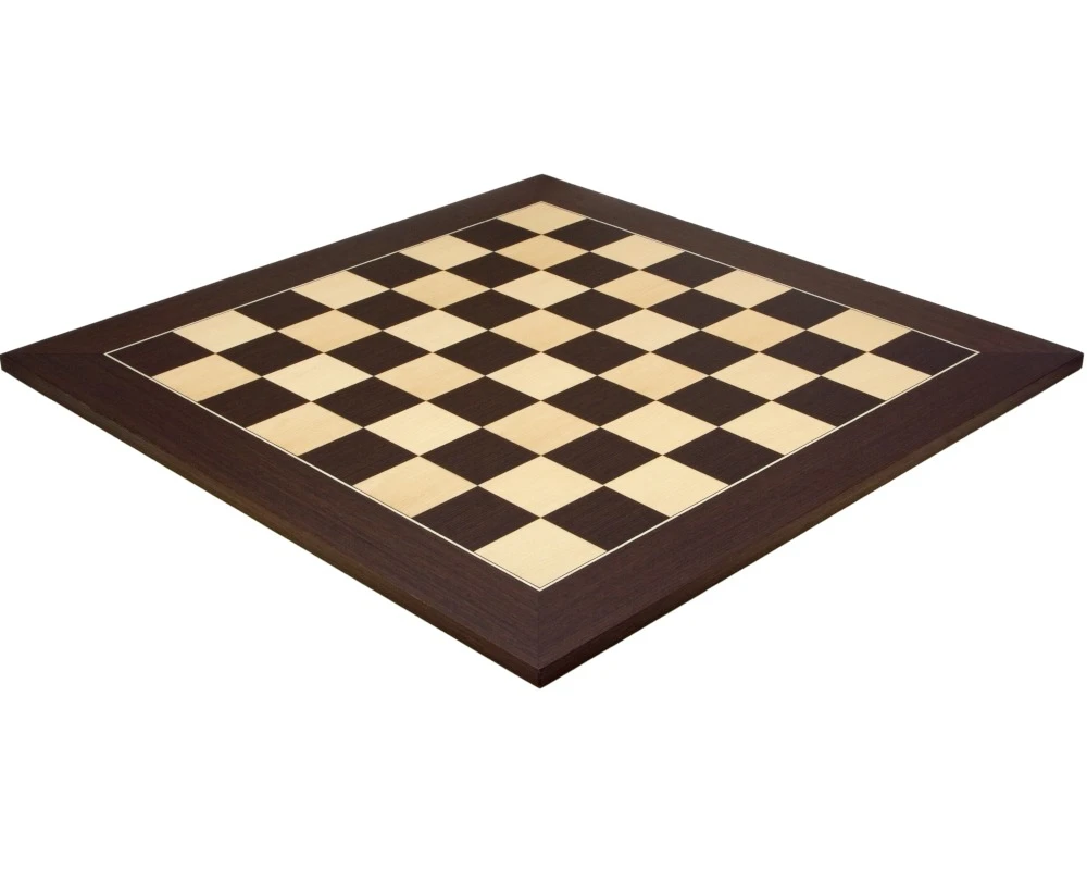 Wenge wood is frequently used in modern interiors due to its parallel graining and abundance in dark, rich tones. This superb quality, extra large chess board is produced by master chess board maker Rechapados Ferrer of Spain. High grade wenge and maple veneered construction is used throughout, including the base. Modern fabrication techniques are used, which provides a board with clean, contemporary lines and critical detailing. This board is perfectly complemented by chess pieces with a king height of 4 inches (102 mm).