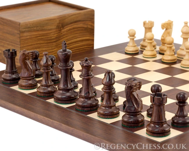 A large Staunton chess set that combines our fabulous Atlantic Rosewood and Boxwood chessmen with a wonderful Montgoy Palisander Rosewood and Maple chess board at almost 22 inches in width. This is a fantastic chess set to play on! The chessmen are heavy, balanced and finished to perfection. The detailing of the carving is exceptional as is the quality and depth of tone found in the solid Indian Rosewood used throughout. Each chess piece is weighted and has a protective felt base. The chessboard is made in Spain using European sourced Palisander and Maple veneers. it has a wonderful light satin lacquer coating which provides a sooth playing surface and offers a decree of protection to the wood. Finally, the set includes a solid Golden Rosewood ( Sheesham) chess piece case and is a traditional sliding lid design. Inside the case there is a large plush fabric lined compartment for the chessmen, prefect for stowing the pieces when not in play. This really is an impressive, brawny Staunton chess set that will provide years, if not generations of glorious chess playing.