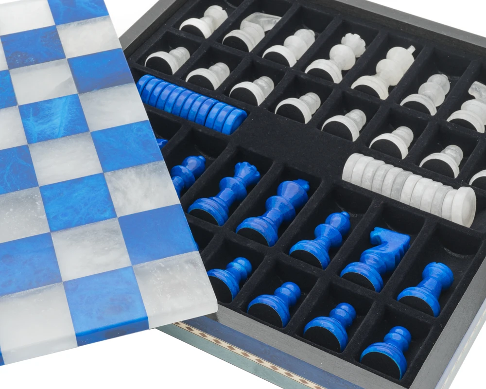 Handmade by Scali Alabastro of Italy, this luxury chess set boasts an edge to edge polished alabaster chess board lid with an inlaid wooden cabinet to house the chess men. Each chess piece is made from the same colour alabaster as the board so it all matches beautifully. The blue in this set is particularly striking and a superb contrast to the almost glass like hues of the lighter pieces and squares.