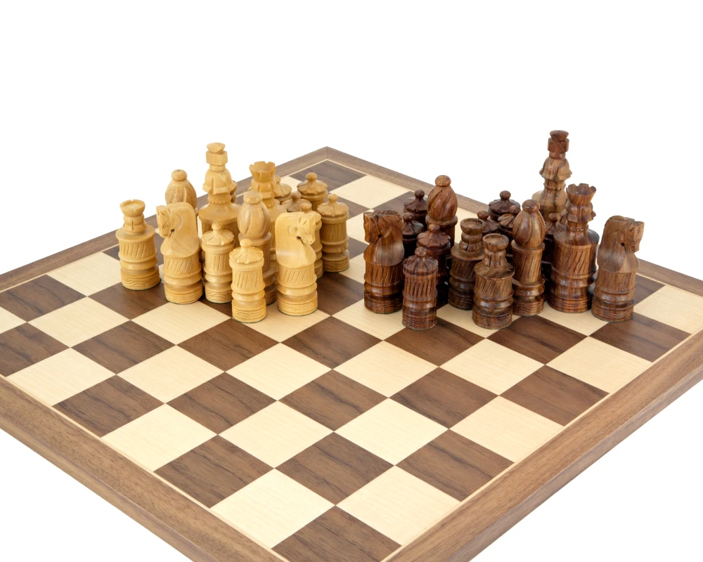 Allegorically styled chess men, hand carved in solid Exotic sheesham wood and Boxwood. Influenced by ancient cultural designs, these chess pieces are a pleasure to behold. We have included an excellent 18 inch Walnut and Maple chess board which matches well with the rich yellow and red tones of the chessmen. A distinctive and quirky chess set that represents superb value for money. Please note that due to the hand crafting technique, each piece is slightly different in finish.