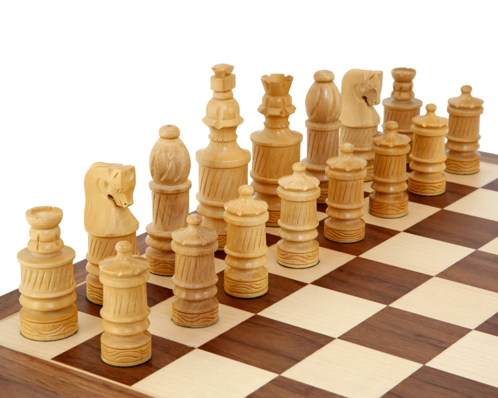 The chess board in this set has been expertly crafted by Rechapados Ferrer in Spain using precision laser cutting techniques and stunning wooden veneers combined with expert lacquering and finishing. The underside of the board is finished in a satin veneer that is a different colour from the playing surface of the board. The veneers used for the underside may vary in colour from batch to batch.