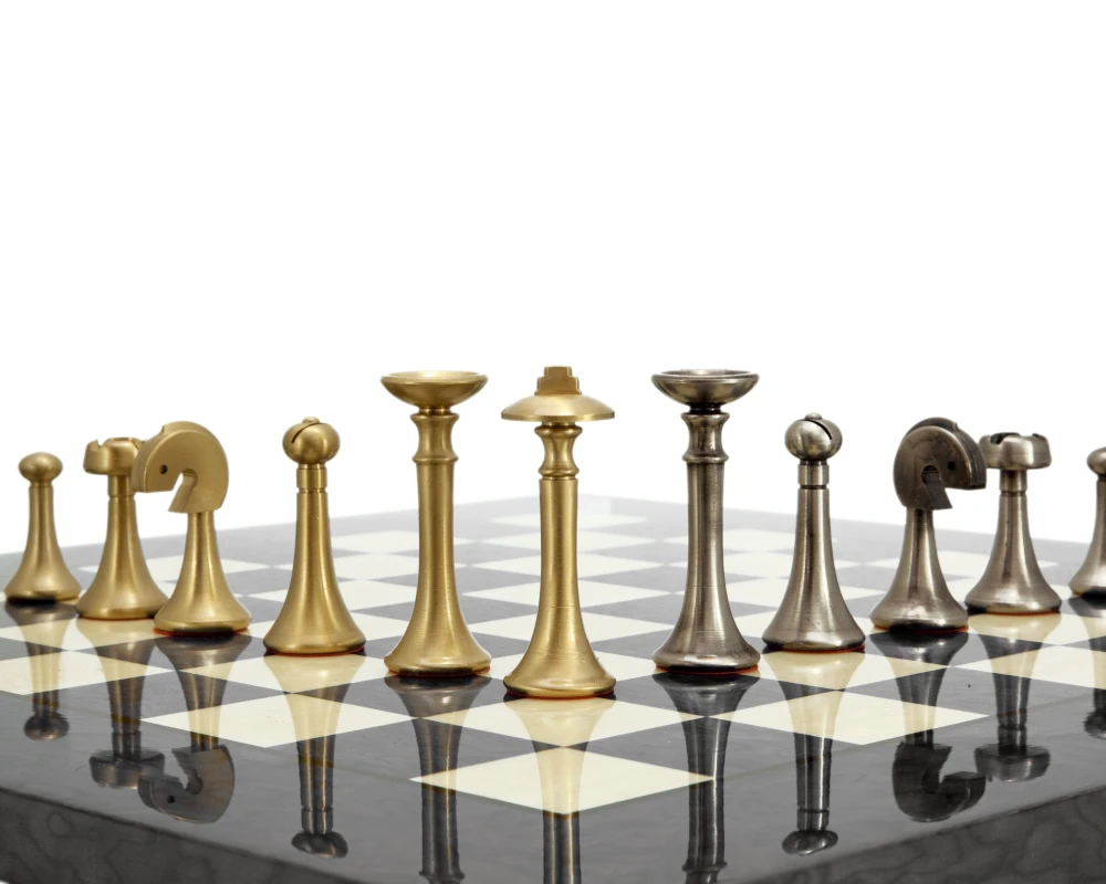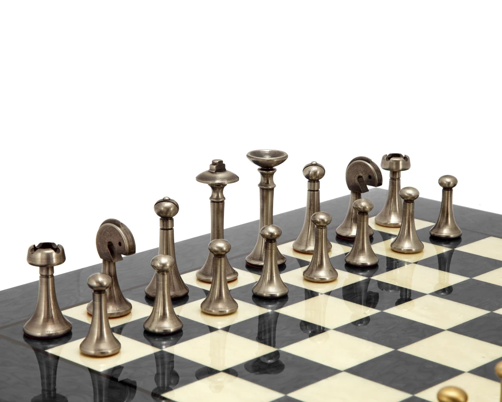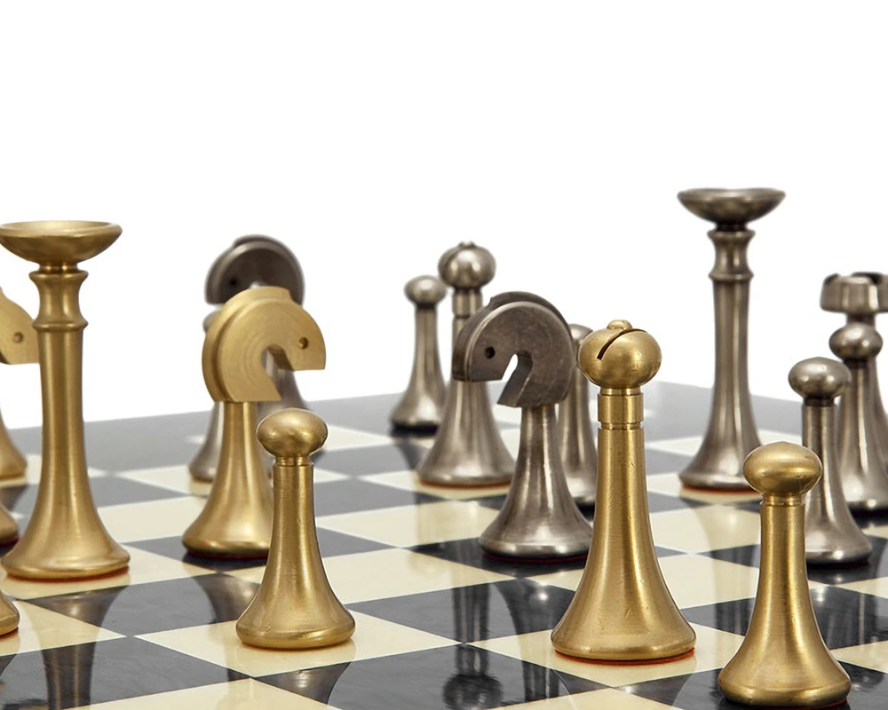 Both the board and pieces, designed and fabricated by professional chess artisans from Italy and are a complete departure from the classic wooden chess board and piece combination. The solid Brass and Nickel plated Brass construction of the pieces very special, with understated character. They are a good weight and feel nicely balanced in the player’s hand. They are hand turned carefully finished and polished. The design of these pieces harks back to the modernist movement of the early twentieth century. The pieces are fitted with red felt pads on their underside to protect the playing surface and are presented in a special cardboard presentation box, making them the perfect gift.