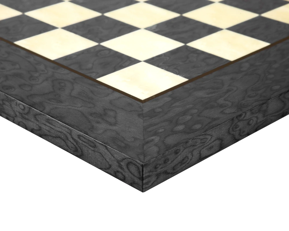 The Italian made Erable and Elm Burl board in a warm dark grey simply mesmerising. Finished in a very high gloss lacquer, the wood grain and knotting of the burl looks almost three dimensional under the rich lacquer. The inlaid veneer squares are bordered with a thin veneer of Ebony that sections of the playing area from the edge. The underside of the board features a lacquered wooden veneer and has felting pads to protect surfaces underneath.