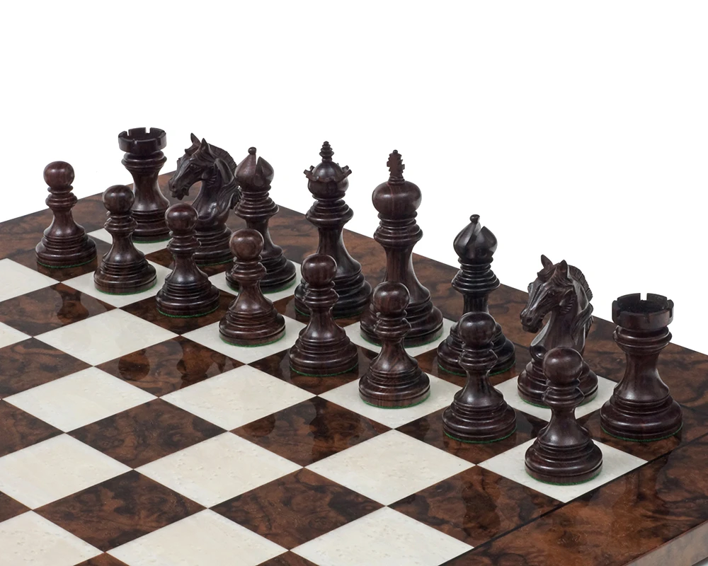 Due to their imposing size, The Garvi Series chessmen require a board measuring 23 inches (60 cm). We have matched these pieces with a beautiful board from Italy to create The Luxury Staunton Garvi Rosewood and Walnut Grand Chess Set.