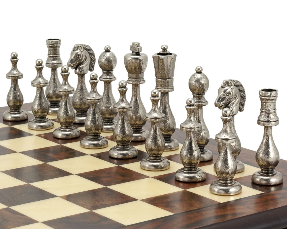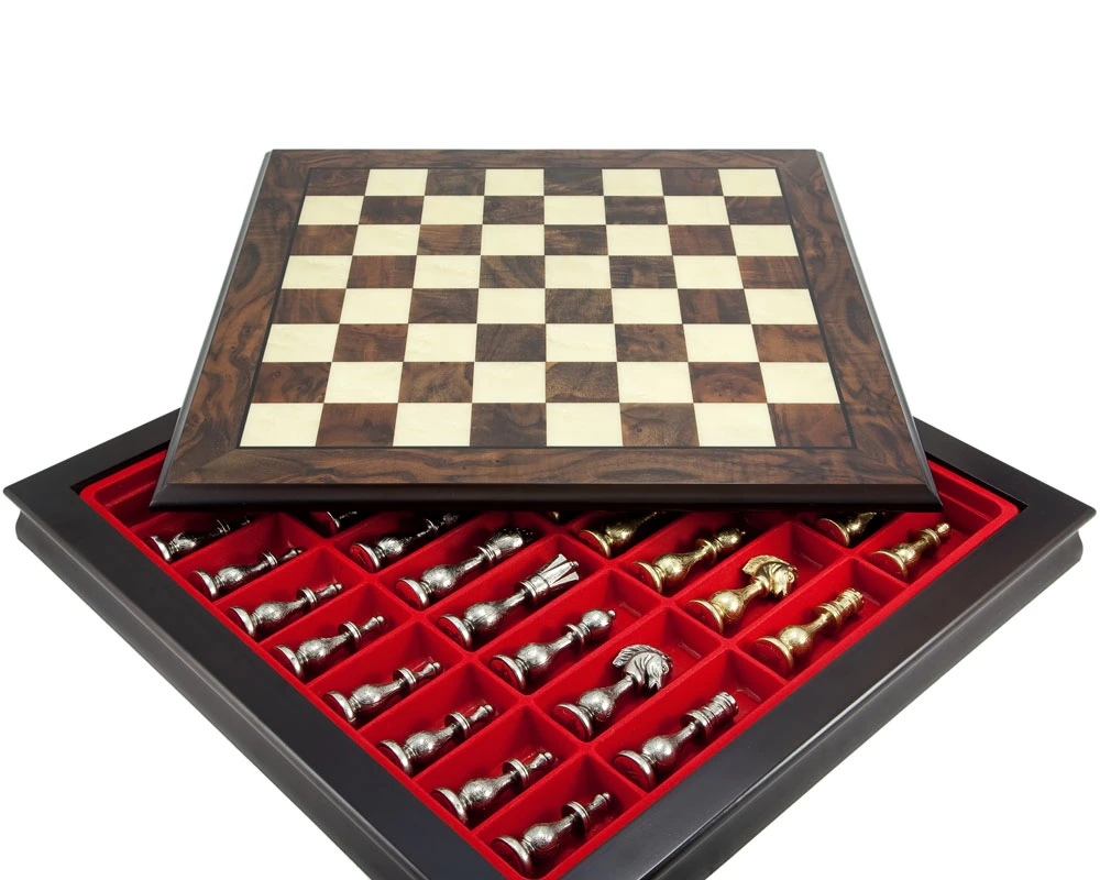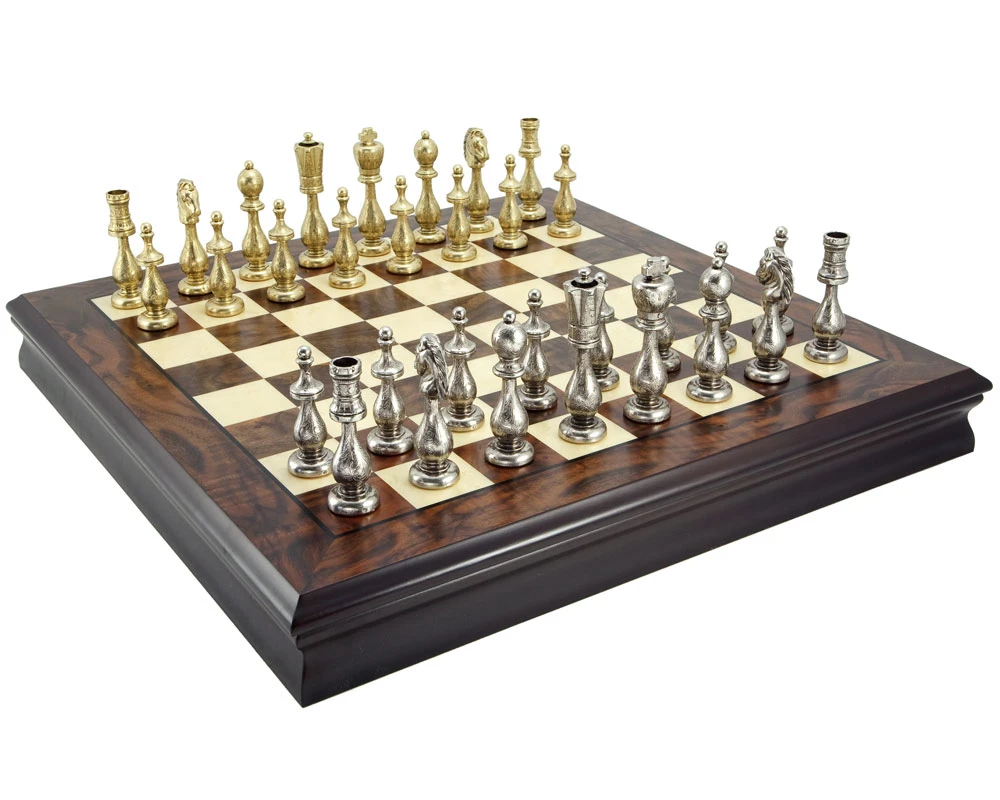 Beautifully constructed Walnut and Maple veneer chess cabinet with lift off lid and chess piece storage. Crafted in Italy, this chess cabinet is manufactured to exacting standards in quality and design. Finished in a rich satin lacquer, the cabinet manages to mix the contemporary with the traditional to create a stunning chess showpiece that will provide years of enjoyable chess playing. The moulded edges of the cabinet are finished in a dark brown with gray flocked underneath to protect any table surfaces. The bundle is completed with our ornate Brass chessmen from the Maghreb series. Brass and Nickel plated Brass cast, finished by hand and beautifully figured, these chess pieces are tall, heavy, distinctive and offer something different over standard wooden pieces.