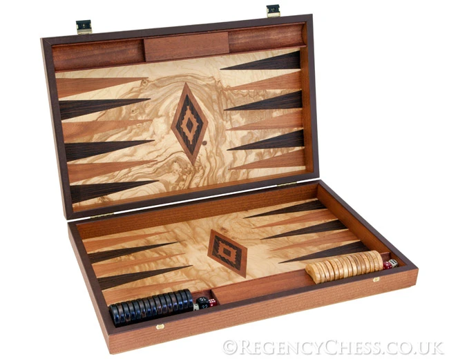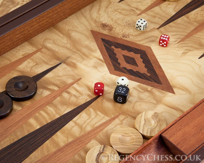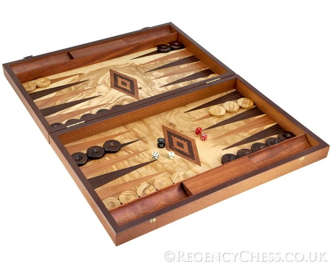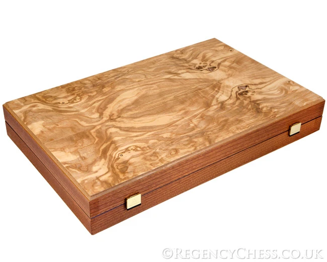 Completely made in Greece by world famous backgammon manufacturer Manopoulos. The cabinet features real wood inlays of Olive burl and has two lacquered brass clasps that lock the cabinet when not in use. The pattern and knotting of this beautiful cabinet face is staggering. Inside, the playing field is made from black stained wood, with points made from inlays of Walnut and Maple. the The playing stones also made from Olive wood and are lacquered. The set includes 4 dice and a doubling cube. Includes Dice Cups