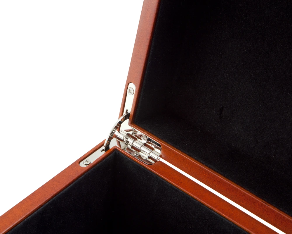 Perfectly constructed Rootwood Veneer Chess Piece case that features plush black flocked compartments and a black flocked base. The construction of this case is extremely good, resulting in a cabinet that is hard to fault. The lid is attached via chrome plated quadrant hinges that have been flawlessly countersunk into the wood. Quadrant hinges not only look good, but they stop the cabinet lid from folding back too far, allowing the lid to safely rest open. The cabinet also features a contemporary looking chrome plated clasp that keeps the unit securely closed when stowed.