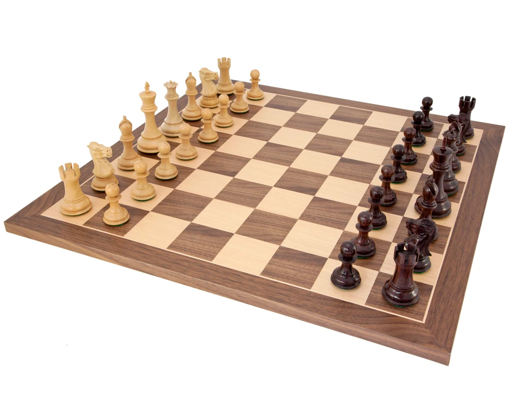 We have combined these luxurious chessmen with our subtle, but beautifully finished walnut and maple chess board. This board has a relatively small footprint for the square size, making it superb for players who want a quality, full tournament size chess set that isn’t too big for their table.