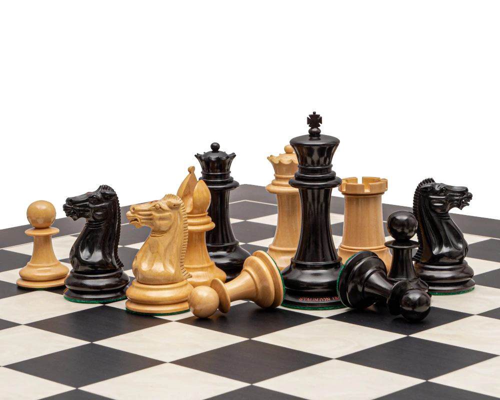 Highly detailed and superbly finished, these 1849 Reproduction Staunton Chessmen, with a 4.4 inch king, are handcrafted in high quality ebony and boxwood in the form of the world famous and classic Staunton design.