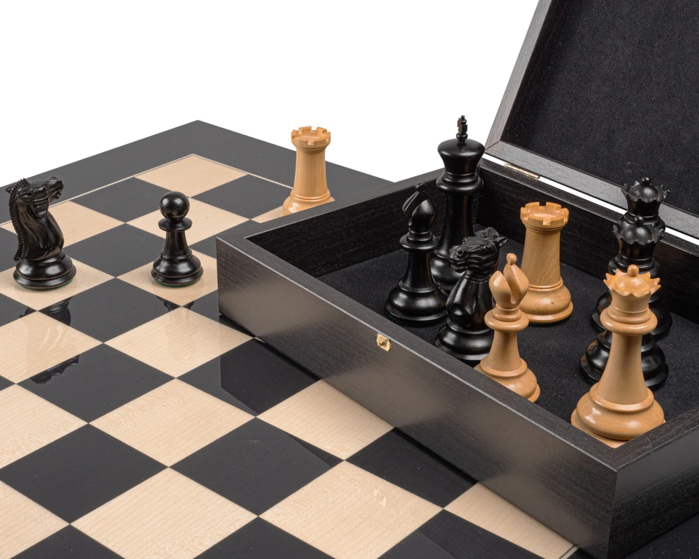 A commissioned design made by Rechapados Ferrer S.A. of Spain, the board is of a high grade veneer construction implementing beautiful black anegre around the border and edges of the board. At 23.6 inches (60 cm) in width and with a square size of 2.36 inches (60 mm), this deluxe chess board is substantial in size. The playing surface is created from veneer squares of jet black anegre wood and light maple wood. It is then finished in a rich deep gloss lacquer creating a chess playing surface with the deepest of blacks. Perfect for these chess pieces.
