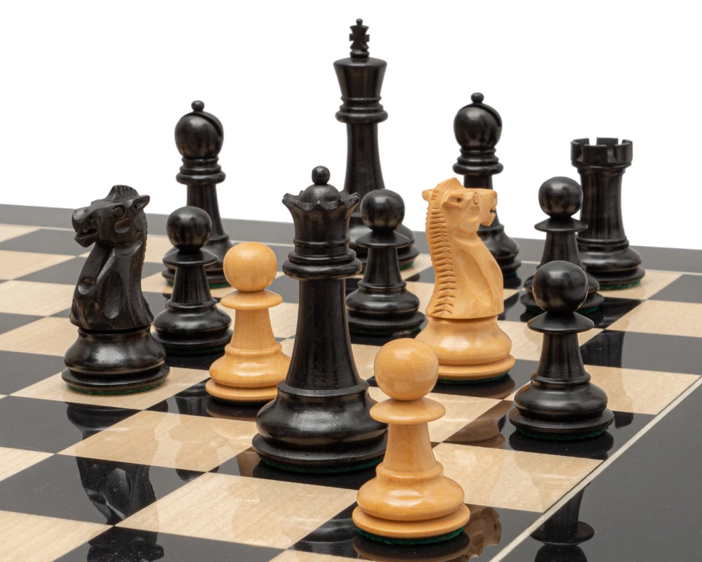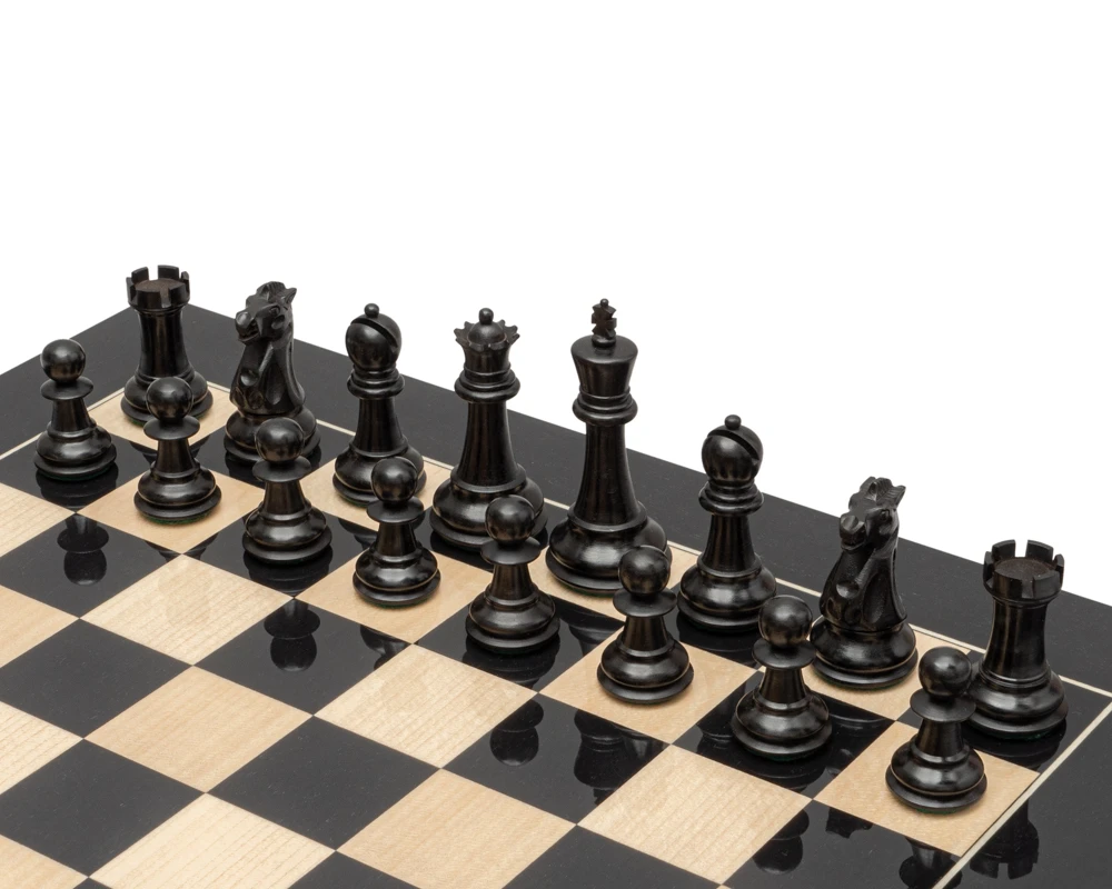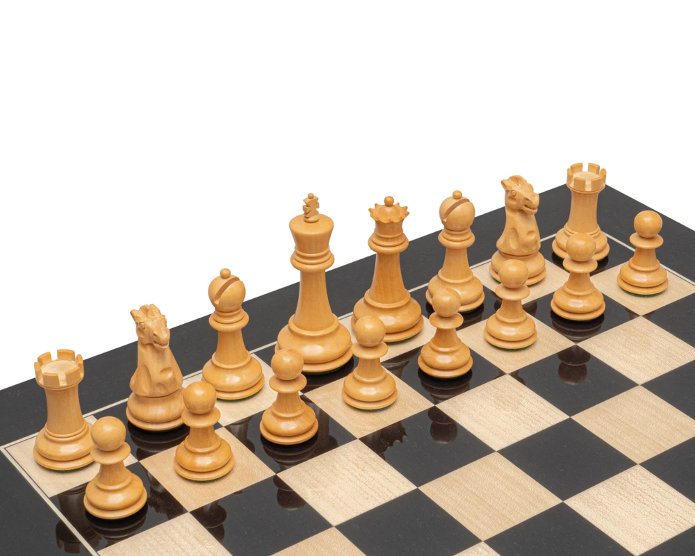 We have matched these pieces with the beautiful Spanish board constructed by Rechapados Ferrer, from quality veneers of black Anegre and maple woods. This contemporary look is a perfect playing area with the high gloss finish reflecting all the pieces beautifully.