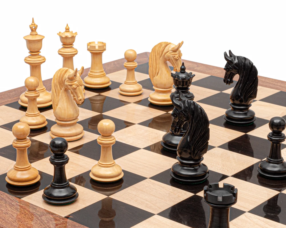 The Blackburne Ebony Chess Men are a welcome new addition to the comprehensive range here at The Regency Chess Company and these stunning chess men deserve nothing less than a stunning battlefield so we have matched them with something really special. A solid wooden board.