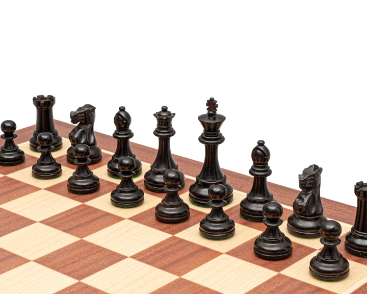 A heavy board with a solid feel, and very well finished, it is the perfect battleground for these British Ebonised Chess Men.