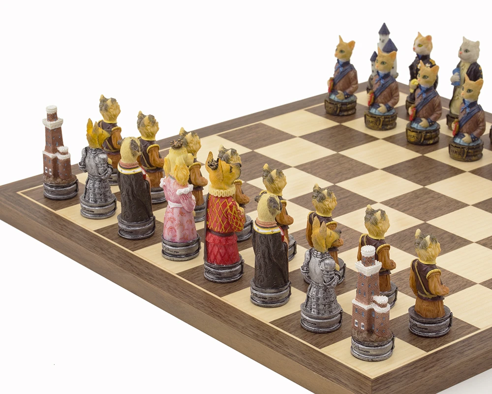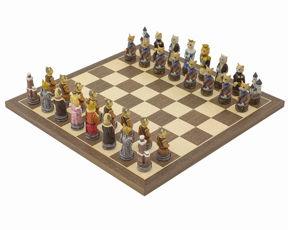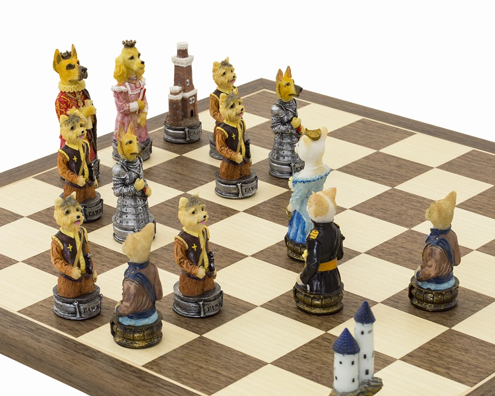 These pieces are matched with a beautiful 15.75 inch walnut and maple board from Spain to give you a stunning chess set, however The Cats vs Dogs Chess Men are also available without the board. Either way, this is a perfect gift for any cat, dog or animal lover.