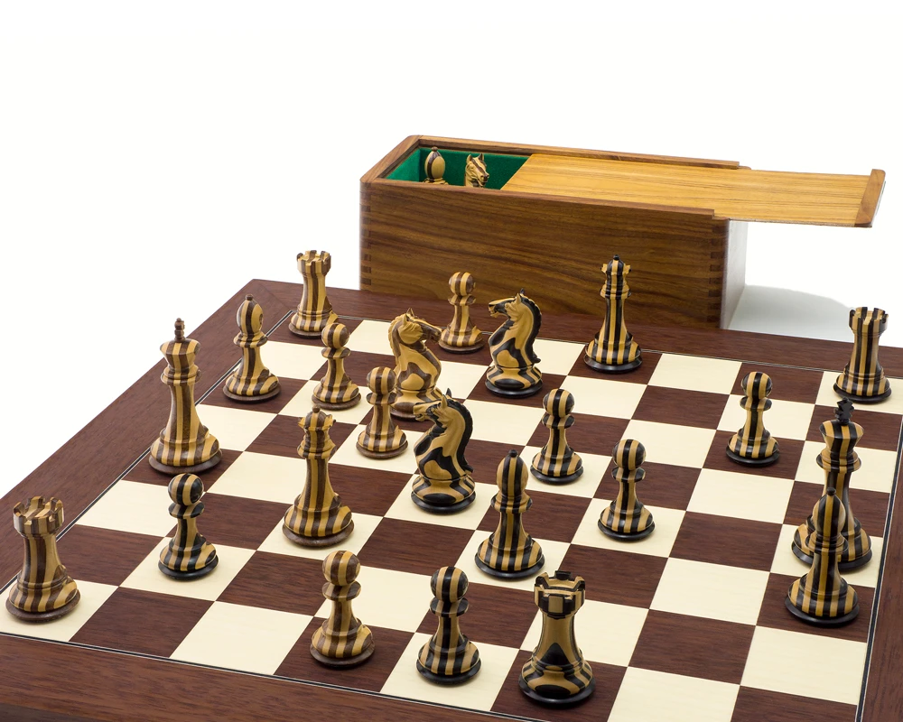When they are off the board a solid sheesham 11 inch (28 mm) chess case holds the Hancock Striped Chess