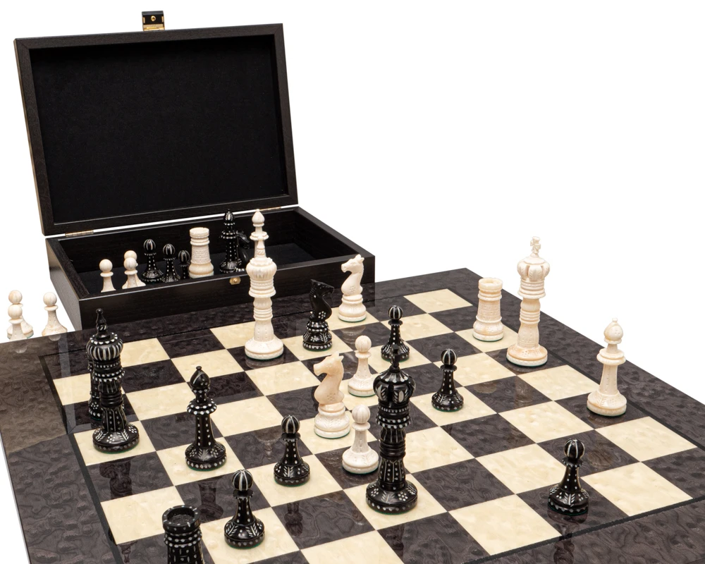 The royals wear exquisitely overstated crowns and the knights are unbelievably detailed from base to head. The king is 4.25 inches tall and has a wide base diameter of 1.3 inches (34 mm), making the King’s Cross Camel Bone Chessmen most comfortable on the beautifully crafted 20” grey briar board from Italy. With its stunning burr chequer board and high quality gloss finish, these pieces reflect regally on this playing field.