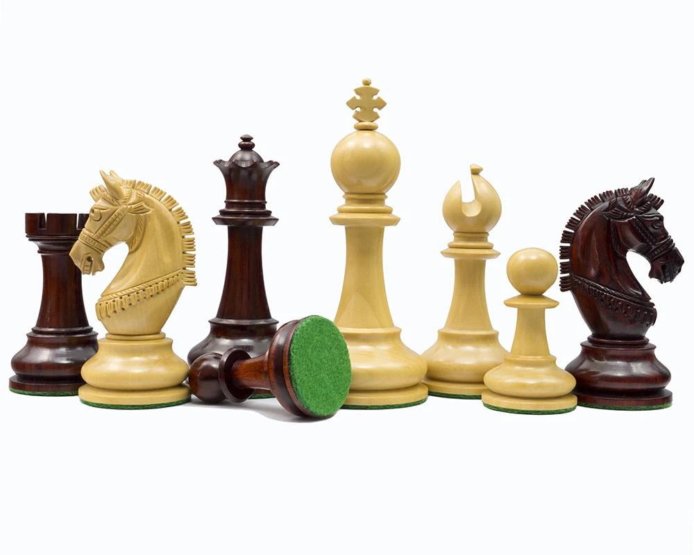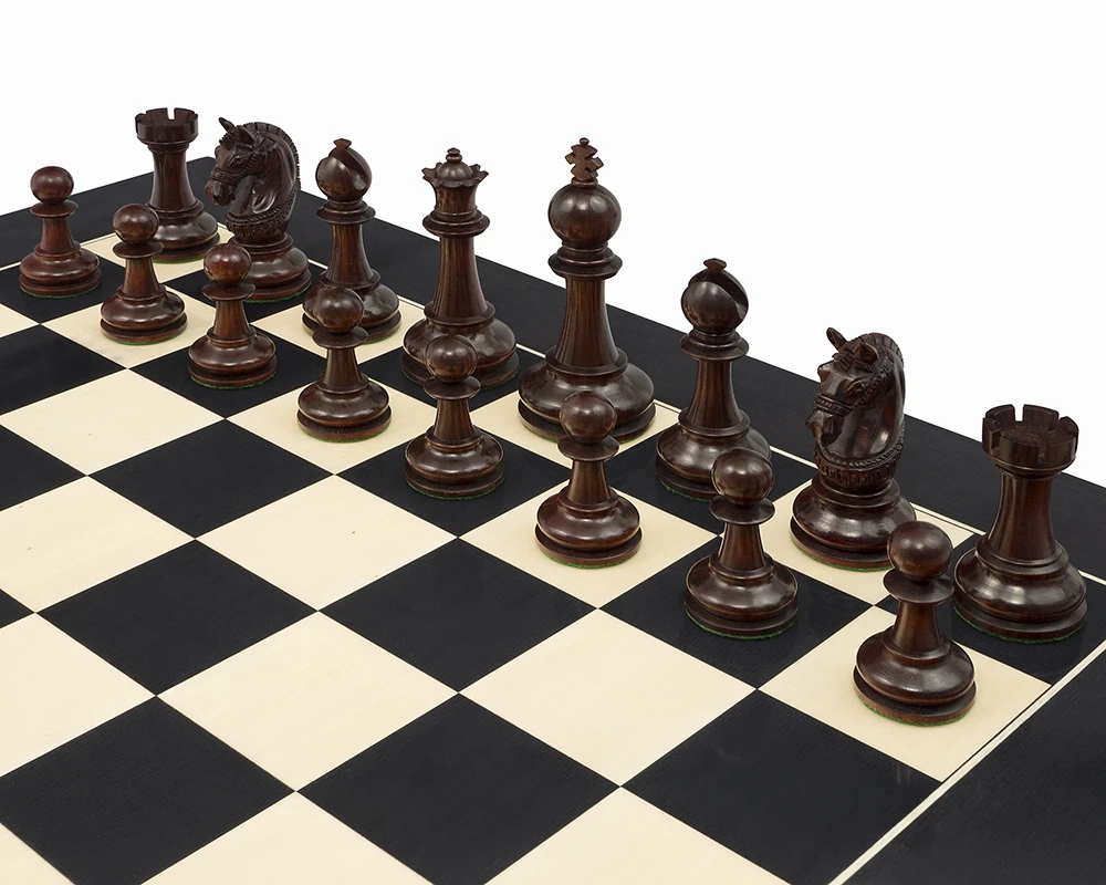 The deep red of these pieces complements playing surfaces made from similarly dark woods.