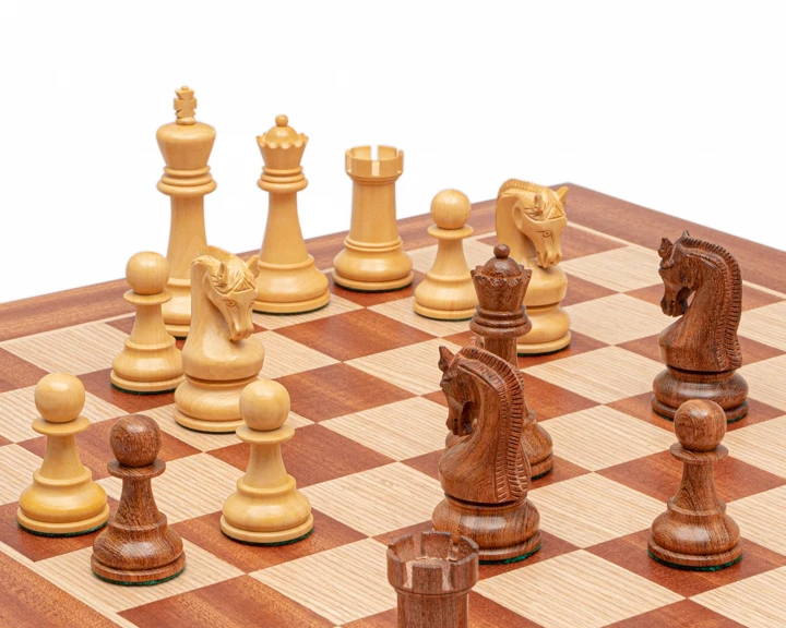 The Leningrad series comprises sets of quality large chessmen available in ebonised boxwood, acacia and anjan. The dark pieces in this set are crafted from acacia, a beautiful grained wood that is slightly lighter than Golden rosewood (sheesham).