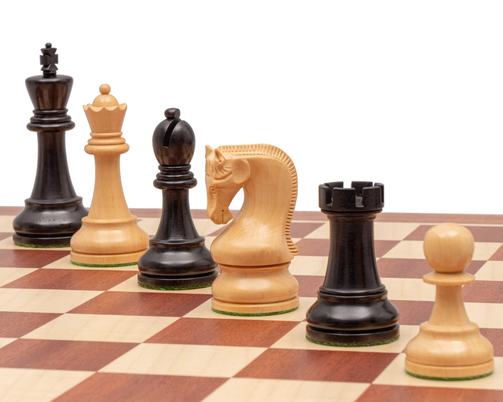 We have chosen a nineteen inch veneer chess board with fine quality inlays to accommodate the Leningrad Ebonised Chess Men. This is a classic design that is available in most chess outlets, however our version has been crafted in Europe to a very high standard and represents superb value for money for such a good quality wooden chess board. The Regency Chess Company is proud to be selling the very best version of this classic design.