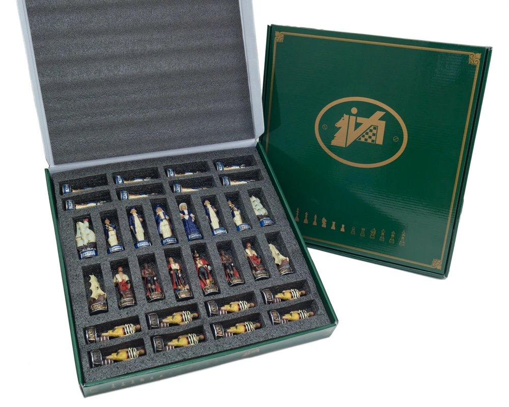 Made by the world famous Italfama, each of these chess pieces has been crafted from crushed stone composite. The exquisite detailing flows from the pawns, portrayed as British Infantry and swashbuckling deckhands, through to the knights and bishops. Both of these are portrayed as higher-ranking officers or pirates.