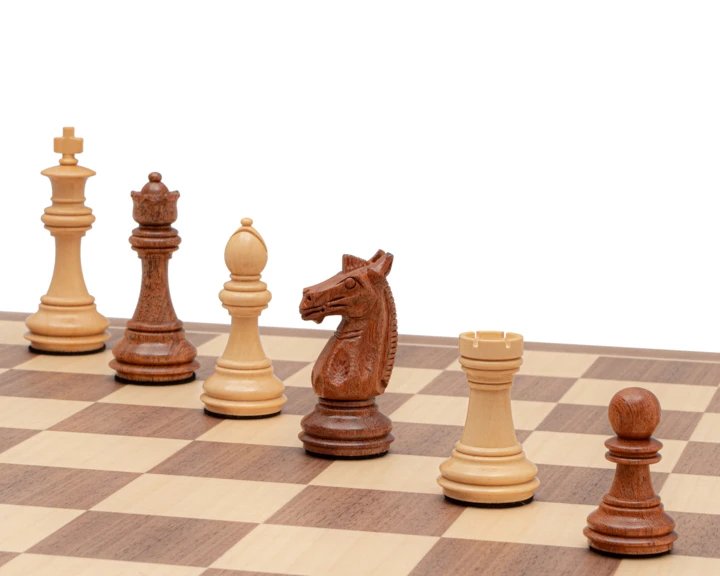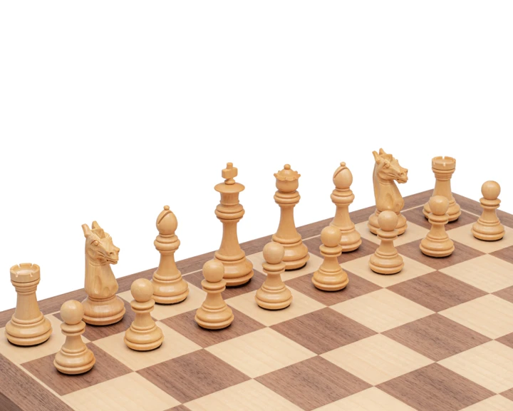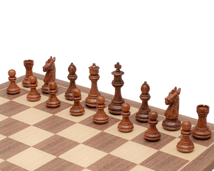 We have matched them here with a 17.75 inch, quality chess board produced by reputable chess artisan Rechapados Ferrer S.A. of Spain. High grade Walnut and Maple veneers have been used in its construction and modern fabrication techniques has produced a board with clean lines and critical detailing. The Walnut grain is simply seductive and a beautifully veneered wooden base adds the finishing touch.