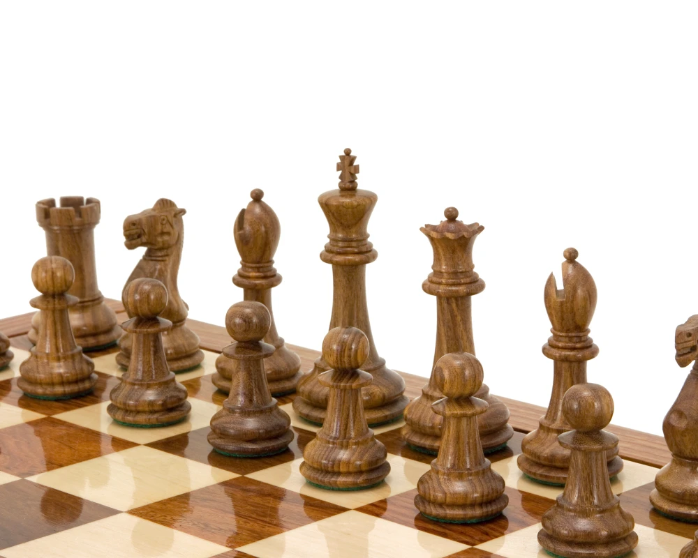 Hand turned and naturally polished to bring out the magnificent deep grain of sheesham wood, the Victoria Series Sheesham and Boxwood Chessmen represent great value for money. The detailing is superb and each piece is nicely weighted with a green flocked base. They are a perfect match for any of our 20 inch sheesham playing boards.